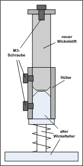 So wurde dann mit der Wickelrolle verfahren. Am alten Aufwickelteller wurden die Mitnehmer abgeschliffen. Man erhält dann einen 6mm dicken Zapfen. Auf diesen kam eine Hülse mit entsprechendem Innendurchmesser stecken und in diese wieder ein 6mm etwa 3cm langer Stift, das ist die neue Wickelrolle. Die Hülse erhält zur Arretierung von Stift und Zapfen jeweils ein Loch mit M3-Gewinde zur Aufnahme einer Schraube. Oben wird die Wickelrolle mit einer Scheibe (größer als 6mm im Durchmesser) und einer M3-Schraube abgeschlosse, damit der Faden nicht runter läüft. (Bei der Wickelrolle zum Hochfahren wurde zur besseren Funktion der Durchmesser vom Wickelstift auf 3mm verringert und die Feder zum Andrücken des Tellers durch eine stärkere ausgetauscht - damit wird insgesamt die Zugkraft erhöht.) Das Bild zeigt einen Test zur Wickelung mit einem Sternzwirn-Faden. Links wird das Seil auf der Rampe nach unten, rechts nach oben gezogen. |