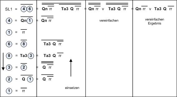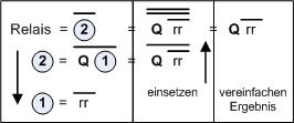 Aus der Wahrhetstabelle kann man sofort auch die Schaltfunktion ableiten. Vom Ausgang z.B. Relais schreibt man rechts die Eigabegrößen hin. Ist dabei wieder ein Meßpunkt, so muß dieser wieder durch die Eingabegrößen beschrieben werden. Das wird solange betrieben bis rechts keine Meßpunkte stehen, dann setzt man rückwärts alles ein und erhält am Ende oben die Schaltfunktion. Die läßt sich eventuell mit den Gesetzen der Schaltalgebra vereinfachen, hier z.B. die doppelte Negation hebt sich auf (siehe folgendes Bild).