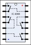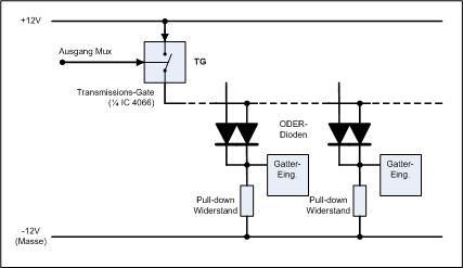 ![]() Mit dem IC 4066 (bzw. CD 4066BE; 4 TG's) könnte die Schaltung so aussehen. (weitere Beschreibung zu Transmissions-Gate unter NAND) |