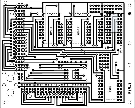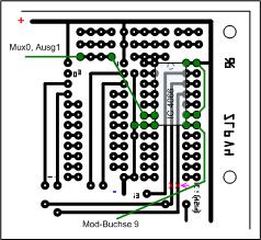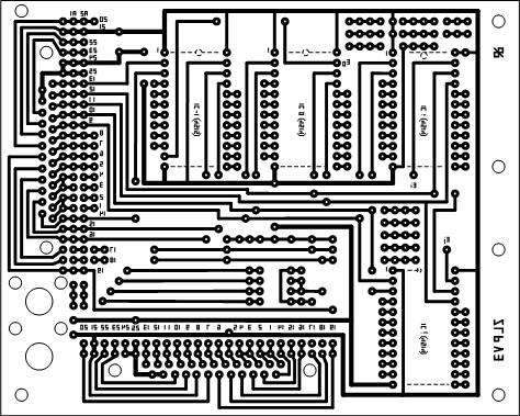 weiteren zentralen Leiterplatte fortgesetzt werden. Es sollten, wie das Bild zeigt, für alle Anschlussstifte Lötaugen vorhanden sein. So könnte ein 24-poliges IC eingesetzt werden (das IC 4066 ist 14-polig). Die Schaltung entspricht der vorhergehenden. Man sollte jedoch die gekennzeichneten Leitungen trennen. Das Konzept der veränderten Leiterplatte ist bereits vorhanden (ZLP V4). |