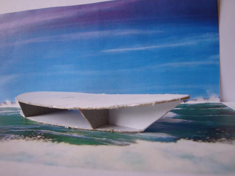 Unten ist die so entstandene Abwicklung dargestellt. Die sollte nun mit einem Computer-Grafiksystem in eine entsprechende Datei verwandelt werden. Oben ist dann die fertige Bordwand zu sehen. Man muss sich aber darüber im Klaren sein, dass die exakte Form der Bordwand erst nach mehreren Anpassungen entstanden sein wird.