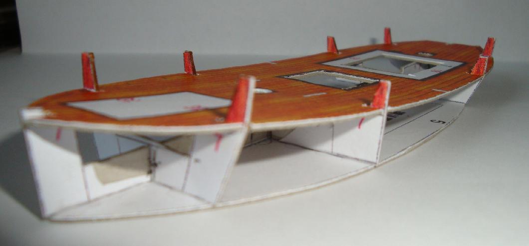 Der Rumpf ist etwa so ähnlich wie die Schreiber-Bogen-Schiffe konstruiert worden, er beginnt erst an der Wasserlinie. Es gibt Querspanten und vorne ein Stück Längsspant.