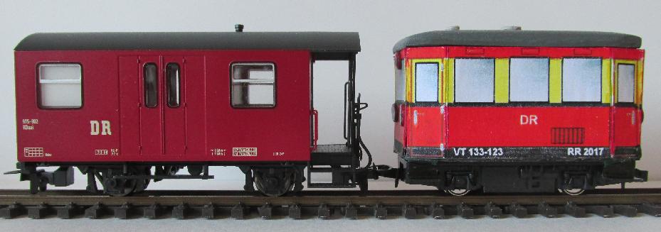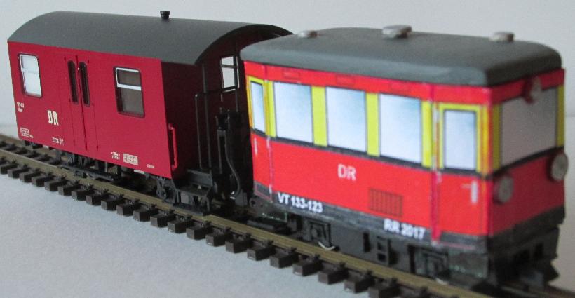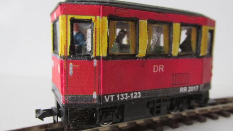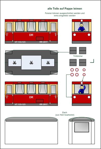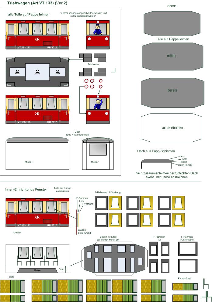 Es wurde noch eine zweite Variante des Triebwagens erarbeitet, d.h. der Körper bleibt wie bisher, aber es wurden die Fenster ausgeschnitten und hinterklebt, eine Inneneinrichtung aus Bänken gestaltet und eine Dachkonstruktion aus drei Pappschichten genutzt. Damit entsteht auch ein rämlicher Eindruck. Das Dach wurde dann aber auch noch grau angestrichen (sieht besser aus). Hier kann man den Ausschneidebogen als pdf-Datei runterladen. |