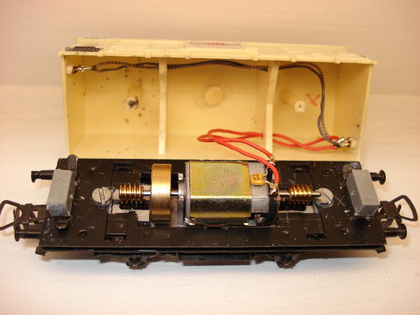 In einem An- und Verkauf konnte ich preiswert unter anderen einen gut erhalten Beiwagen eines Schienenbusses erwerben. Dieser war ein Beiwagen eines 3-Schienen Systems (also leitend verbundene Räder und ein Mittelschleifer, da dieser Wagen mit Licht ausgerüstet war). Als zukünftige Nutzung ist ein analoges 2-Schienen System vorgesehen und aus dem Beiwagen sollte ein Triebwagen werden. Zum Umbau wurde das Laufwerk komplett entfernt, es blieb also nur das Gehäuse übrig. Als Antrieb wurde nun nach einem brauchbaren Teil gesucht und bei pmt gefunden: