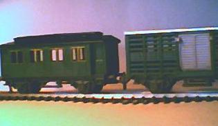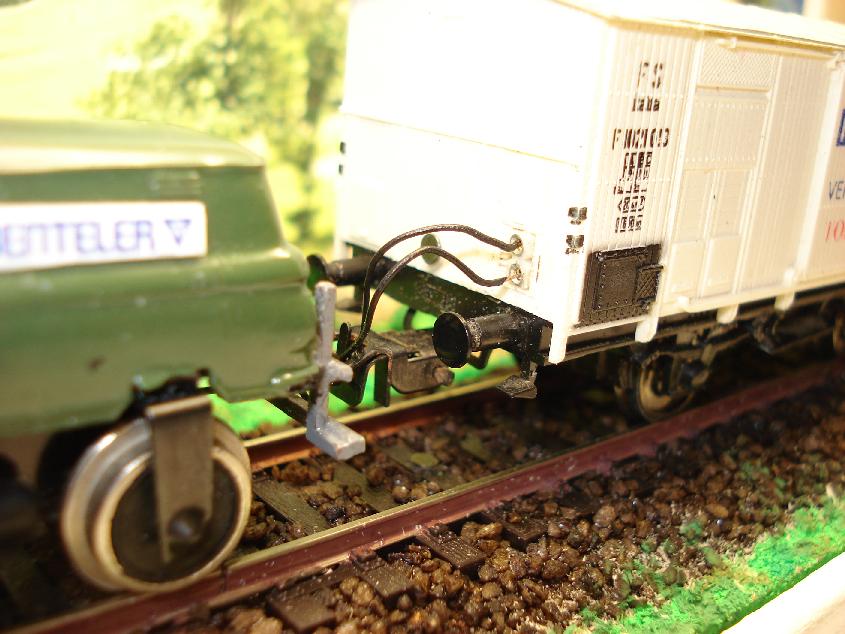 Die beiden Loks bekamen vorne und hinten jeweils einen Haken aus Draht anstelle einer Kupplung, die Wagen behielten die vorhandenen Kupplungen. Sie wurden nur dahingegend geändert, dass sie einfach in den normalen Kupplungsbügen eingehängt werden konnten, auf der anderen Seite bleibt die starre Kupplung, hier können nun nur noch die Billig-Wagen angehängt werden.