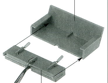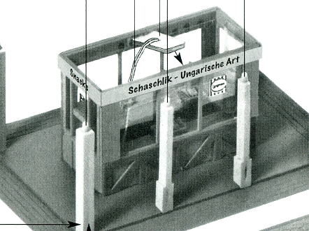 oben im Kasten und strahlen die Reklame von hinten an. Ich habe den Kasten innen mit weißem Papier beklebt, das reflektiert das Licht ein wenig. Als Lampen nutze ich 3mm weiße LED, die machen ausreichend Licht (beim Schützenhaus oben 6mm mit weniger Leuchtstärke). Die Aufnahme der Lampen besteht aus 2 Plastik Teilen, diese wurden innen so verändert (ausgeschliffen), dass die 3 Widerstände (1KOhm) dort untergebracht werden konnten. (Bild aus Bauanleitung) |