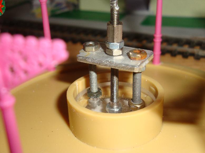 die Keilriemenscheibe einmal gedreht), das sollte ausreichend sein. Die Keilriemenscheibe habe ich einfach aus 3 zusammengeleimten Pappscheiben hergestellt (die mittlere ist etwas kleiner). Das geht, da ja keine Ansprüche an den Gleichlauf gestellt werden. An die Stelle wo der Fallermotor eingesetzt werden soll, kommt eine passende Plastkscheibe und drüber in einem Abstand eine zweite (oder anderes Teil). Damit haben wir ein Lager. Die Aufnahme des sich drehenden Teils des Karussells erfordert einen auf einer Seite etwas abgeflachten 3mm Bolzen. Nun muss man noch die richtige Höhe der Konstruktion ermitteln. Ich habe als Achsen M3-Schrauben verwendet und oben zur Anpassung einen kleinen Bolzen über eine dicke Mutter angefügt (da kann man leicht die Höhe variieren). Die Sache hat aber einen Nachteil, denn die Drehbewegung des Karussells ist immer so, dass die Schrauben gelöst werden. Und man glaubt es gar nicht, aber die Plastikteile haben eben auch eine Masse, die ausreicht die Schrauben zu lösen. Um an die Konstruktion im Fehlerfall zu kommen, habe ich den oberen Teil des Karussells nicht verleimt. |