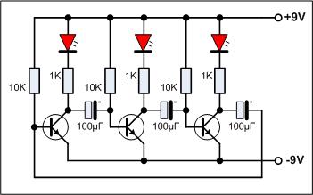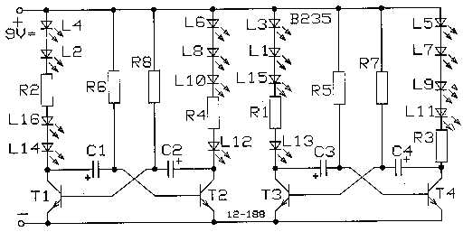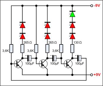 Die Schaltung dazu (von einer anderen Realisierungsform) sieht etwa wie dargestellt aus. Es handelt sich um eine Art eines Lauflichts auf Basis einer Transistor-Schaltung. Als Transistoren werden pnp-Typen verwendet, es ist dafür eine andere Spannungsversorgung notwendig (muss man einfach beachten). |