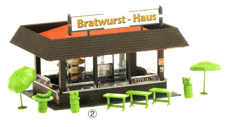 beschriebenen Buden sind, lediglich die Tiefe beträgt etwa nur die Hälfte. Das kann man doch NOCH nutzen! Und man hat noch die Wahl, ob die Bude verglast werden soll oder nicht. Man klebt vorne lediglich eine Front vor, die Ausschnitte sind die Verkaufsluken und die kann man im Plastkteil eben auch ausschneiden oder nicht. Die Rück- und die Seitenwand sollte von innen und außen ebenfalls beklebt werden und schon hat man eine Kirmes-Bude. |