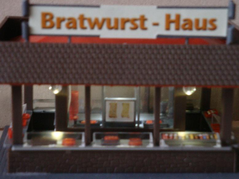 Ich habe dazu einen Ausschneidebogen schon vor einiger Zeit erarbeitet. Auch diese ist beleuchtet, die LED wurde unter dem Verkaufstisch angebracht, ist somit nicht sichtbar und leuchtet die Rückwand an, es war aber nun schon schwierig die Spannung für diese LED zu erzeugen. |