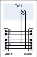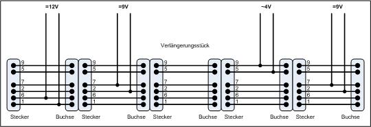 Es werden ein SUB9 Stecker und Buchse verbunden. Das kann durch Zusammenlöten der Lötfahnen von Stecker und Buchse erfolgen oder sie werden durch Leitungen verbunden. Zwei Leitungen werden angezapft und zum entsprechenden Teil geführt, in diesem Fall 12V. Die Leitung zum Teil sollte eine entsprechende Länge haben. |