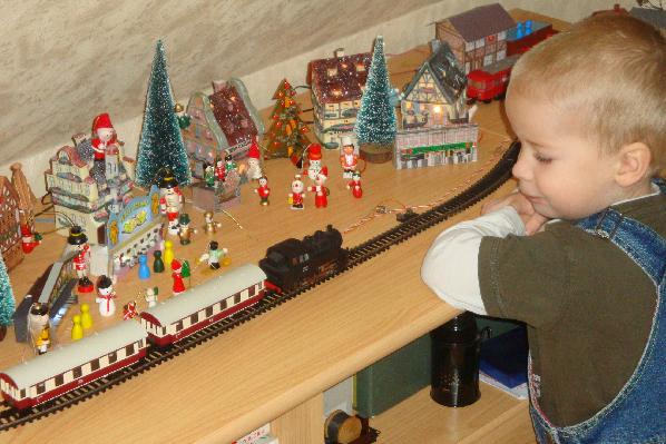 Das ist der Enkel, der sich sehr an der Bahn erfreut. Der Zug fährt mit der