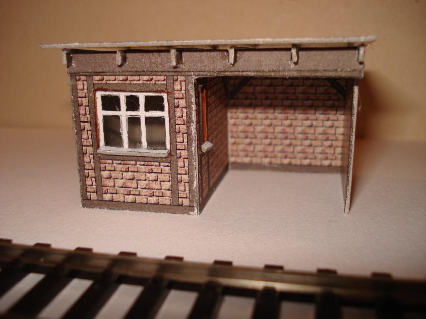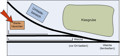 Auf einem Modul wurde eine Haltestelle mit Anschluß an eine Kiesgrube aufgebaut. Da am durchgehenden Gleis gleichzeitig ein Haltepunkt vorgesehen ist, wurde ein kleines Wartehäuschen gebraucht. Gleichzeitig sollte aber auch von hier aus die Bedienung einer Weiche und (eventuellen) Signalen möglich sein, also wurde ein Dienstraum mit integriert. Die zweite Weiche sollte ausschließlich "von Hand" vor Ort bedient werden.