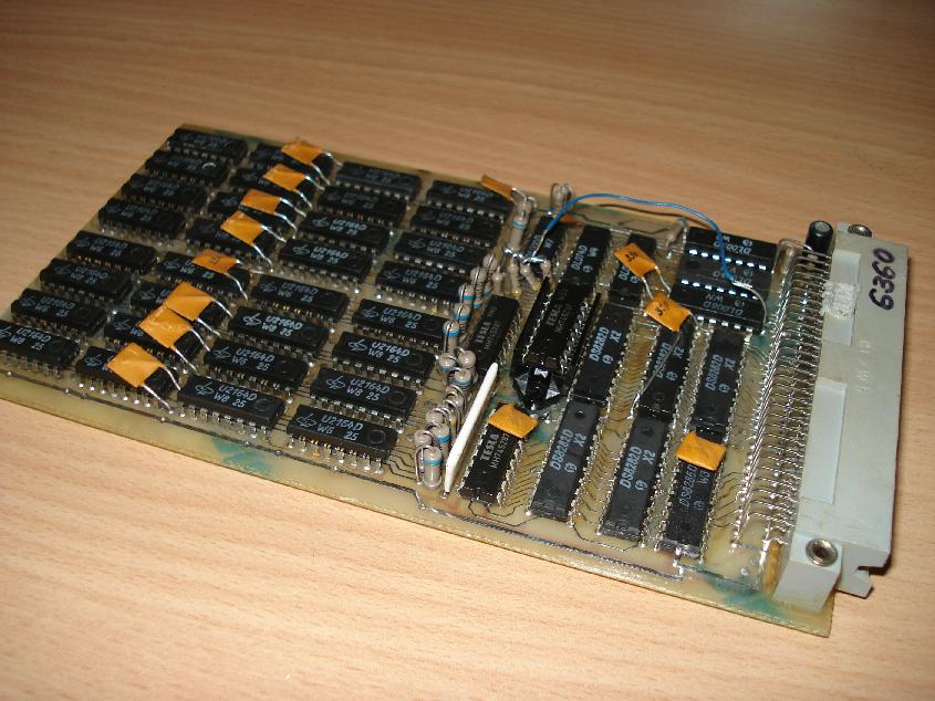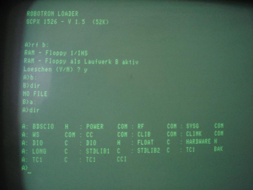 RAM-Floppy Nr.: 256KDRAM 1L-SEITE R233-101/12.1 (1987 / IHS-Warnemünde) Es gab Anleitungen zum Bau einer Speicherplatte, die von der Struktur einer Floppy entsprach. Allerdings wurde die Platte auf den Systembus gesteckt, so dass nun ein extra Programm zur Organisation des Datentransfers nicht über die Floppysteuerung, sondern über das Bussystem erfolgen konnte. Mit dem Start des Programms konnte dem Laufwerk ein Laufwerksbuchstabe zugordnet werden, über den dann in der Folge in üblicher Weise das Laufwerk angesprochen werden konnte. z.B.