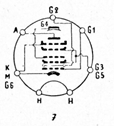 | Heizstrom = 650mA Anodenspannung = 250V Schirmgitterspannung = Ug2=90/UG3=Ug5=70V Steilheit = 0.6mA/V Innenwiderstand = 1.5MOhm Kapazität Anode-Gitter = 0.06pF Belastung = 0.5Watt Gittervorspannung = -9V Anodenstrom = 1.5mA Heizungs-Art = 4V Wechselstr. (Sockel-Bild: 7) | ![]() |