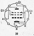 | Heizstrom = 1900mA Anodenspannung = 800V Schirmgitterspannung = 400V Steilheit = 11mA/V Innenwiderstand = 50KOhm Belastung = 60Watt Gittervorspannung = -14V Anodenstrom = 220mA Heizungs-Art = 6.3V Wechselstrom / 200mA Gleich- oder Wechselstr. (Sockel-Bild: 30) | ![]() |