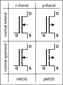MOSFETs! Das obere Prinzip-Bild zeigt einen n-Kanal MOSFET-Transistor oder kurz auch nMOS. Es gibt eine weitere Einteilung nach der Leitfähigkeit im nicht angesteuerten Zustand, zum einen normal sperrend, durch Anlegen eines Potentials an Gate werden Ladungsträger in den Kanal transportiert. Bei der Sorte normal leitend werden diese entfernt, bis zum Sperren. Die Symbolik ist im Bild dargestellt. |
