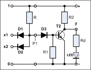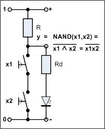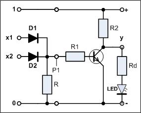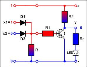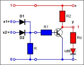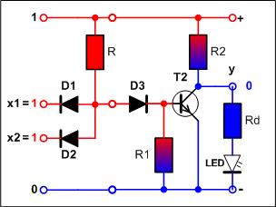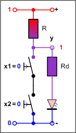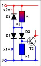 Die Dioden werden so über einen Widerstand mit der Betriebsspannung verbunden. Die Dioden realisieren die Schalter x1 und x2, in diesem Fall ist das aber eine Spannung die an die Dioden gelegt wird, + oder -Betriebsspannung. Diese kann natürlich wieder von Schaltern kommen, aber nun auch von vorgelagerten Schaltungen. Damit haben wir schon mal ein Ziel erreicht! |