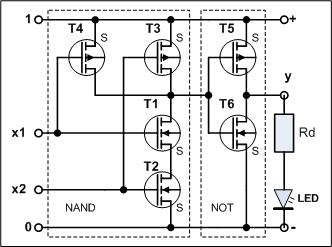 Da der Ladungsträgerstrom quasi durch einen spannungsgesteuerten Widerstand im Kanal gesteuert wird, kann man durch gestalterische Maßnahmen im Design einen bestimmten Widerstand schon bei der Herstellung erzeugen (etwa 100KΩ). Damit fällt auch der letzte Widerstand weg, wir haben nun eine reine TTL-Schaltung! |