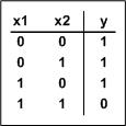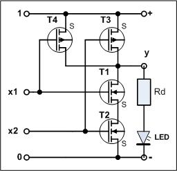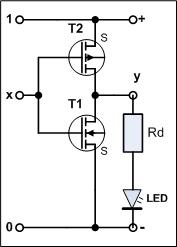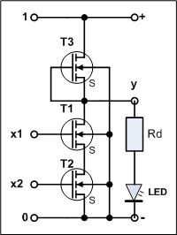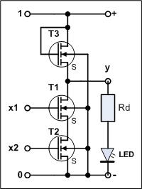 Das wird sicher irgendwie so wie die NAND-Schaltung funktionieren. Es ist aber nur ein Eingang vorhanden. Man sieht schon, dass bei offenem Taster 1 am Ausgang y erscheinen wird, im anderen Fall 0 - also haben wir es mit einem Negator zu tun! |
