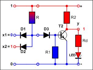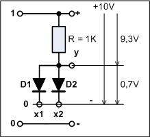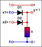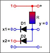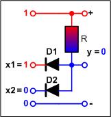 Die Funktion dieser Schaltung kann man am besten an kleinen Bildern demonstrieren. Wird an eine Diode oder natürlich auch an beide 0 (-) gelegt, ist diese in Durchlassrichtung geschaltet. Das bedeutet, dass über den Widerstand R nun die gesammte Spannung abfallen muss. Man sagt auch, der Punkt y wird auf 0 gelegt. Also für: