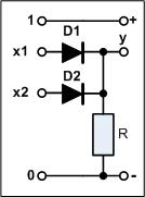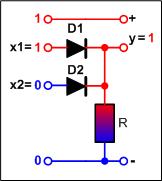 Liegt an beiden Dioden 0, dann erscheint auch am Ausgang y = 0. Sofern x1 oder x2 oder beide Eingänge 1 sind, erscheint am Ausgang 1 - das aber ist genau die Definition für OR! |