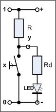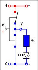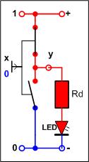 Das ist theoretisch so richtig! Die Verhältnisse ändern sich, wenn ein Verbraucher zwischen y und - angeschlossen wird. In diesem Fall wird eine LED mit Vorwiderstand Rd angeschlossen. Nehmen wir einmal an, das die LED einen sehr kleinen Widerstand gegenüber Rd hat, dann können wir diesen vernachlässigen. An y stellt sich nun nach der Spannungsteiler-Regel eine Spannung proportional zu den Widerständen ein. Sind R und Rd gleich groß, z.B. 1KΩ, dann halbiert sich die Spannung an y, bei z.B. 10V stehen nur noch 5V zur Verfügung. Man muss also versuchen, die Betriebsspannung über den Verbraucher abfallen zu lassen. Das geht nur, wenn R den Wert 0Ω hat! Aber Achtung, werden nun beide Schalter geschlossen, gibt es einen Kurzschluss zwischen + und -! Daraus folgt, dass der Widerstand R sein muss, er sollte möglichst klein sein, aber je kleiner, um so größer ist auch der Stromverbrauch der Schaltung. Bei einem Widerstand R von 10Ω fließt bei 10V nach dem Ohmschen Gesetz