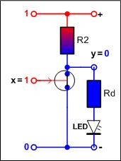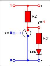 Diese Bilder untermauern diese Aussage. Ist der Schalter offen, steht an y entsprechend dem Widerstandsverhältnis von R2 zu Rd eine entsprechende positive Spannung zur Verfügung. Ist der Schalter hingegen geschlossen, fällt die gesamte Spannung über R2 ab, an y ist folgerichtig die Spannung 0. Der Schalter wurde so in einen Kreis gesteckt, es soll so etwa ein Relaiskontakt sein, aber nur so etwa! |