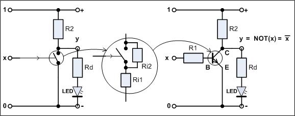 In der WWW-Seite " Kleiner Grundlagen-Kurs " wurde das digitale NAND-Element durch eine UND-Schaltung mit einem nachfolgenden Transistor-Negator realisiert: