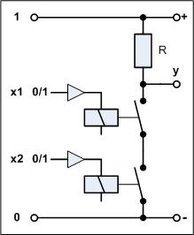 Das wäre so eine Möglichkeit! Die Taster werden durch die Kontakte eines Relais ersetz. Die Relais werden über Verstärker angesteuert, somit kann man mit xi = 1 die Schalter schließen. Das Problem bei dieser Lösung ist, dass man wohl kaum solche Relais in einen integrierten Baustein mit nötiger Größe ("Kleine") einbringen kann. Wir brauchen andere Lösungen. |