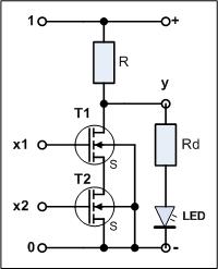 und damit gelten die Gesetze wie beim Einschalten von Kondensatoren und aus diesem Grund sind MOSFETs für Schaltungen mit hohen Frequenzen ungeeignet) Die MOSFETs können im sperrenden Zustand ein Source-Drain-Widerstand von mehreren MΩ (MegaΩ), im leitenden Zustand dagegen von nur wenigen Ω haben - das sind nun ideale Schalter! Es bleibt nur der Arbeitswiderstand R. Der ist ja notwendig um eine NAND-Funktion zu erzeugen, jedoch sorgt er im Schaltkreis für eine Wärmeentwicklung, denn der Widerstand setzt den Spannungsabfall in Wärme um! Außerdem nimmt die Realisierung im Kristall viel Platz ein - das muss anders gehen? Und da erweisen sich dann die MOSFETs wieder als sehr brauchbar! |