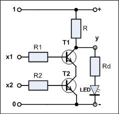 Für den Fall, dass beide Dioden auf 1 liegen, stellt sich etwa folgendes Verhalten ein. Es gibt nun einen Spannungsteiler R - D3 - R1, die Steuerspannung des Transistors ist somit Utr = R1 U+ / ( R + D3 + R1) (z.B.: R=1KΩ; R1=10KΩ; U=10V; - U zwischen R und D3 etwa 9,1V - Utr etwa 8,4V) Damit wird der Transistor sicher angesteuert! Am Ausgang y entsteht etwa der Wert 0. Wir wollen aber nicht aus den Augen verlieren, dass bei Steuerung mit x1 = x2 = 1 y den Wert 0 annimmt und in den anderen Fällen 1 - das entspricht der NAND-Funktion! |