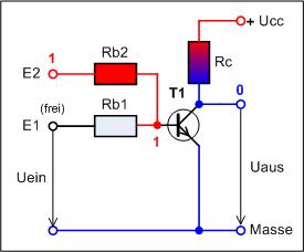 Legt man an einen Eingang (das Beispiel zeigt E2, gilt auch für E1) eine logische 1, also einen positiven Pegel und läßt zugleich den anderen Eingang frei, keine Belegung mit 0 oder 1, dann funktioniert die Schaltung wie der bisherige Negator. Das gilt natürlich auch für die gleichzeitige Belegung beider Eingänge mit 1. |