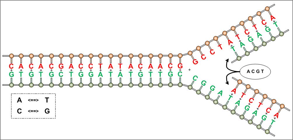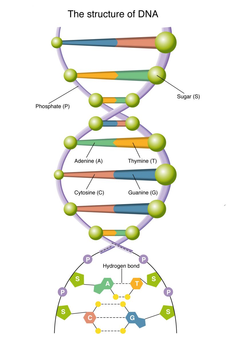 nach https://www.simplyscience.ch/teens/wissen/was-ist-dna " Die Bausteine der DNA sind die sogenannten Nukleotide. Jedes Nukleotid besteht aus einem Phosphatrest, einem Zucker (Desoxyribose) und einer von vier organischen Basen: Adenin(A), Thymin(T), Guanin(G) und Cytosin(C). Nukleotide können sich aneinanderreihen und lange Ketten bilden. DNA-Moleküle bestehen aus zwei solchen Ketten, die umeinander gewunden sind und eine Doppelhelix bilden. Diese zwei umeinander gewundenen Ketten, DNA-Stränge genannt, werden dadurch zusammengehalten, dass sich Basen vom einen Strang mit den Basen vom anderen Strang, miteinander verbinden. Aufgrund ihrer chemischen Eigenschaften paart sich A nur mit T, und C nur mit G, so wie jeweils nur ein Schlüssel in ein bestimmtes Schloss hineinpasst. Man kann sich die DNA wie eine Wendeltreppe vorstellen, in der die Basenpaare die Sprossen bilden. Die Reihenfolge der Basen entlang der DNA-Stränge (also die DNA-Sequenz) bestimmt die Erbinformation einer Zelle. " nach https://www.ardalpha.de/wissen/speichermedien-der-zukunft-dna-speicher-daten-100.html " Gigantische Datenmengen auf DNA Klingt wie Science Fiction, ist es aber nicht: Was USB-Stick und Festplatte können, kann unsere DNA schon lange – nämlich Informationen speichern. Forscher sind der Ansicht, das Speichermedium der Zukunft könnte deshalb aus DNA bestehen. " |