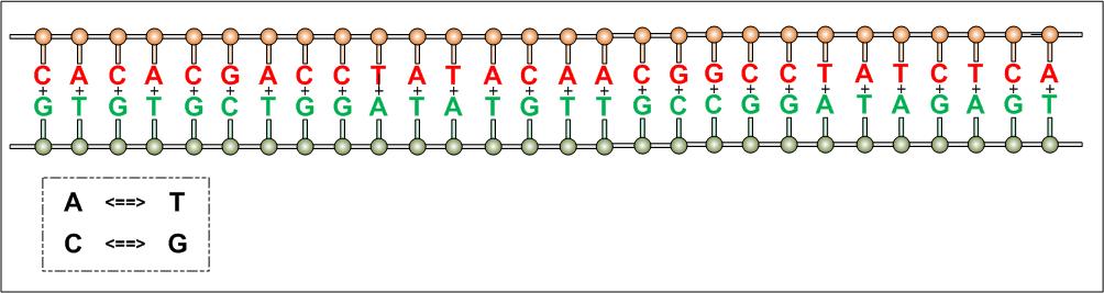 Die menschlichen Erbeigenschaften werden ebenfalls so gespeichert. Da es ja zwischen den Basen nur genau jeweils eine Beziehung gibt, könnte man die "inverse" DNA quasi als Sicherheitssystem sehen, denn eine einseitige Änderung einer Base in einem Strang ist nicht möglich. Ob sich gleichzeitig auch beide ändern können, ist mir nicht bekannt. |