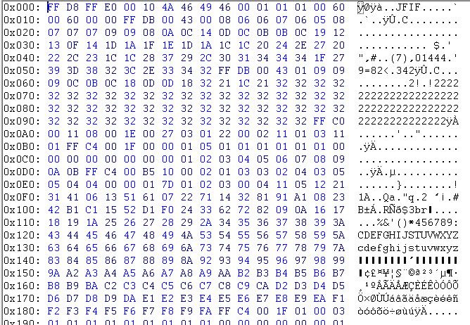 Daraus folgt dann die Darstellung mit 1 und 0: (z.B. 1. Zeile bis Daten 4A) FF D8 FF E0 00 10 4A ... 1111 1111 1101 1000 1111 1111 1110 0000 0000 0000 0001 0000 0100 1010 ... |