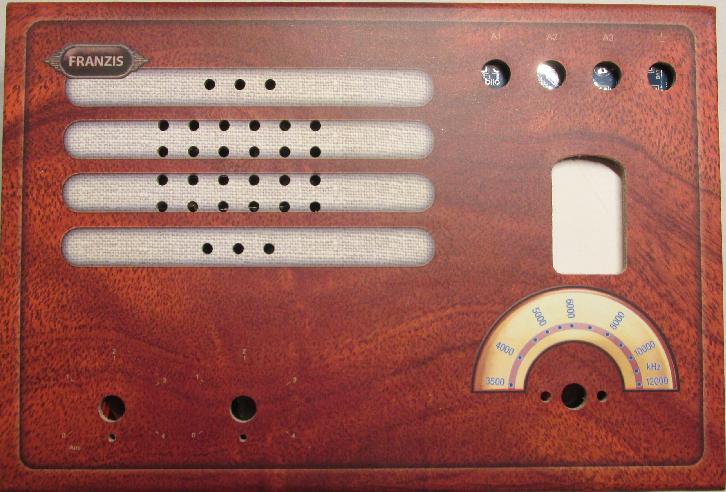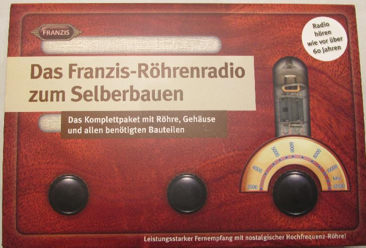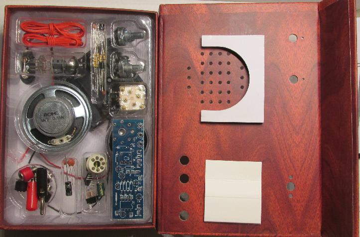 Das Teil ohne Verpackung sieht nahezu genau so aus. Es ist jedoch eine stabile Pappkiste, die schon alle Aussparungen hat, die dann für den Aufbau gebraucht werden, wie z.B. Loch für die Potentiometer (lautstärke, Rückkopplung), für den Drehkondensator, für die Antennenbuchsen und als besonderer Gag ein Fenster, in dem die Röhre zu sehen ist, natürlich auch Öffnungen für den Lautsprecher. |