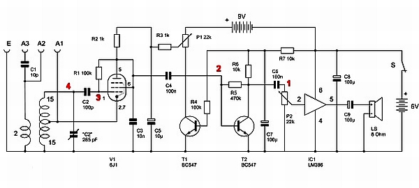 Das ist die gesamte Schaltung des Kurzwellen-Empfängers. Es ist eine Kombination aus einer Röhre, zwei Transistoren und einem Schaltkreis. Die Verstärkung der Röhre wird mittels Potentiometer P1 geregelt indem durch Änderung der Anodenspannung der Arbeitspunkt der Röhre verschoben wird und sich dementsprechend auch die Rückkopplung ändert. Die 6V Versorgungsspannung dient den Halbleitern Bauelementen als Betriebsspannung, der Röhre als Heizspannung und wird mit der Betriebsspannung 9V in Reihe geschaltet und stellt so 15V Anodenspannung für die Röhre bereit. Da der Ein/Ausschalter nur einpolig ist, wird mittels Transistor T1 in Abhängigkeit von der 6V Spannung die 9V Spannung geschaltet (bei Ansteuerung geht der Kollektor-Emitter-Widerstand gegen Null). Der Transistor T2 ist ein Vorverstärker. |