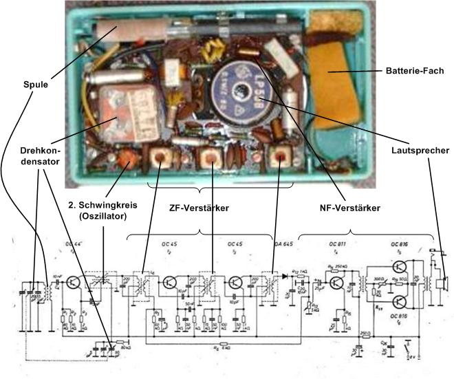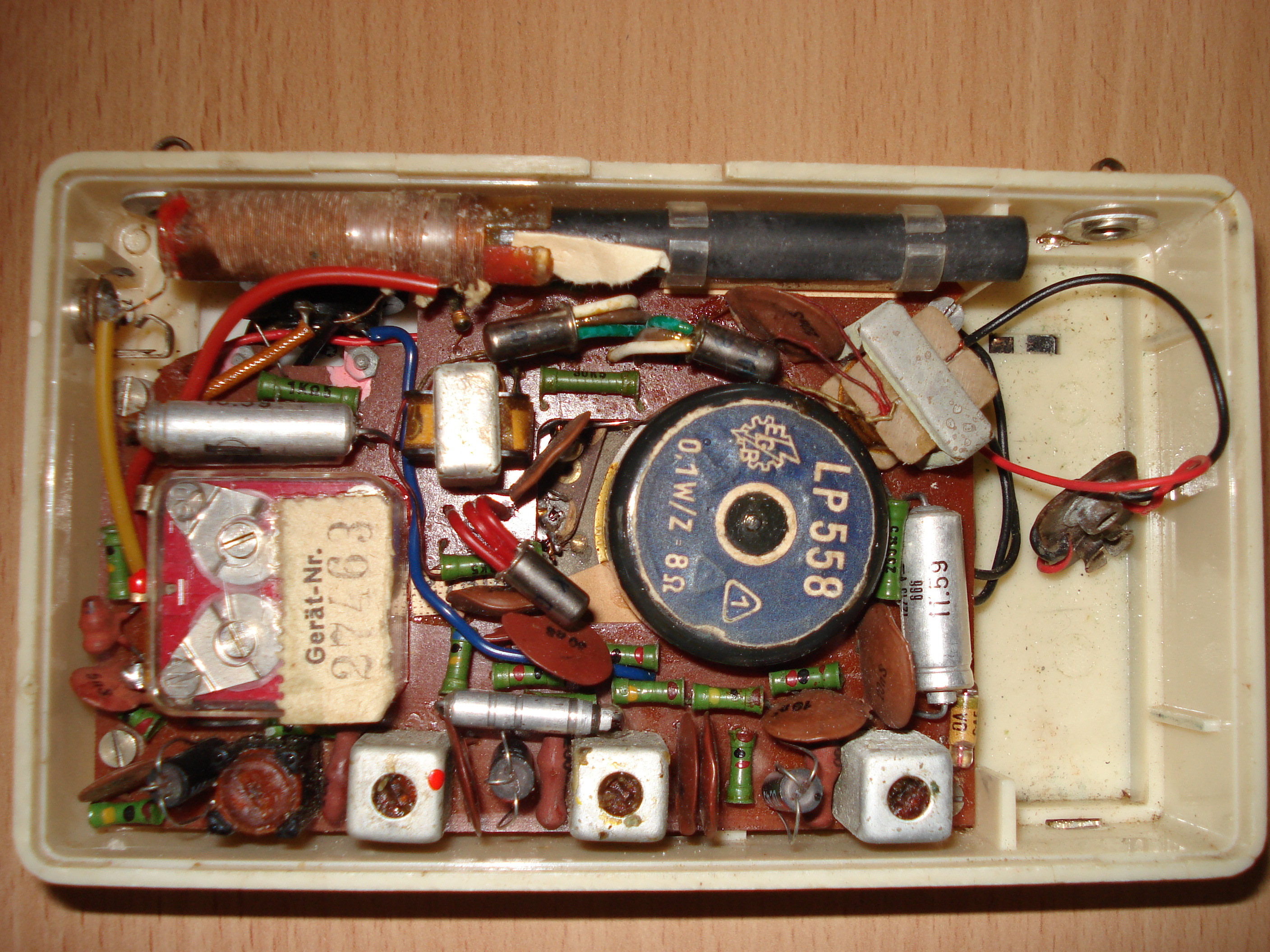 Entwicklung unterschiedliche Teile eingesetzt. Ob gerade letztere GC 301 noch eingebaut wurden, ist nicht sicher - mein Exemplar "Sternchen" hat diese Bauteile (sowohl als Treiber, als auch in der Gegentakt-Endstufe). Mit Klick auf Bild (innen) , erhält man größeres Bild vom Innenaufbau. Interessant ist auch, daß das "Sternchen", natürlich VEB Sternradio Sonneberg wohl entscheident an der Entwicklung und der Verbreitung des 9V-Batterie-Blocks beigetragen hat! |