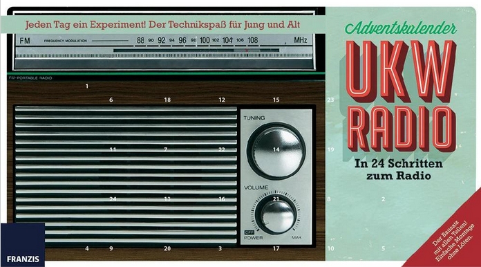 24 Schritte - das klingt nach Adventskalender! Ist es auch, es werden einige Bauteile auf eine Steckplatte gesteckt, kein löten, und am Ende kommt tatsächlicht etwas heraus, was ordentlich Musik macht. Und das in UKW-Qualität, es hat einen ordentlichen Klang. |