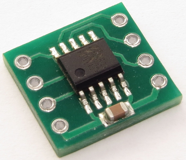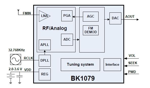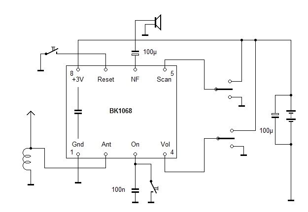 BK1068 Genutzt wird der Schaltkreis BK1068, das ist der DSP, ein kompletter Rechner mit Speicher und E/A-Einrichtungen (das ist fast unglaublich), das ist ein SMD-Bauelement mit etwa 6mm x 6mm Abmessung. Dieser kommt auf eine kleine Leiterplatte mit den Maßen von etwa 1cm x 1,2cm, etwas beschaltet, so dass nur noch 8 Beine im Raster von 2,5mm genutzt werden. Rechts ein Bild zur Beschaltung der Platine.