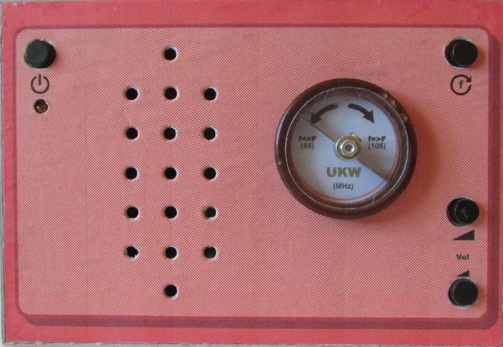 So sieht das Teil nun von vorne aus. Die Maße entsprechen etwa den Gehäusen vom Mittel- und Kurzwellenradio, es ist auch aus Pappe, die Tiefe weicht etwas ab (der Lautsprecher ist Schuld). Die schwarzen Knöpfe sind Schalter für ein/aus, f-reset, laut und leise. Der große Knopf dient der Senderwahl (rechts sieht man, wie es gestaltet wurde, das sind Mikrotaster, die durch eine Schraube ausgelöst werden, da kommt man nur ran wenn die Steckplatte entfernt wird). |