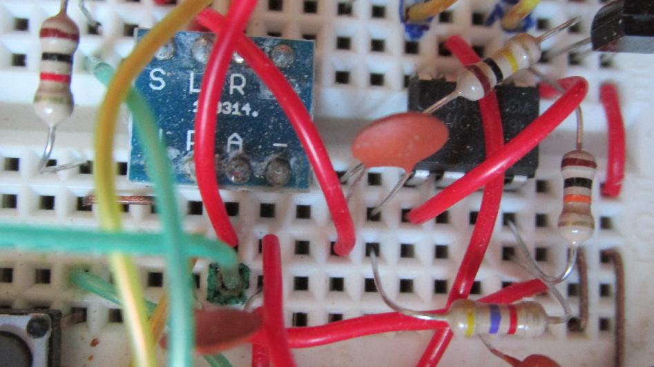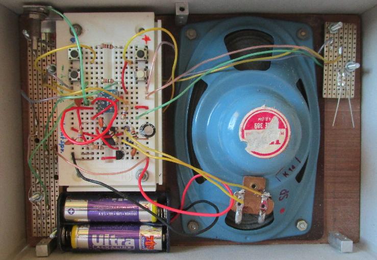 Das ganze wurde nun in einen Kasten eingebaut. Als Lautsprecher wurde ein anderer als der mitgelieferte verwendet, der hat einen besseren Klang. Der und alles weitere wurde auf einer Holzplatte aufgeschraubt, so dass alles komplett aus dem Kasten herausgenommen werden kann. Links neben dem Lautsprecher sieht man die Steckplatine, auf der nur durch Stecken der Bauelemente die Schaltung aufgebaut wurde. Die festen Schalter, die sich hinter den Leiterplatten links und rechts verbergen, haben angelötete Drähte, die aber dann in die Steckplatte gesteckt werden. Im rechten Bild sind sehr gut die beiden Schaltkreise zu erkennen und ein paar weitere Bauelemente - ist ja nicht viel. |