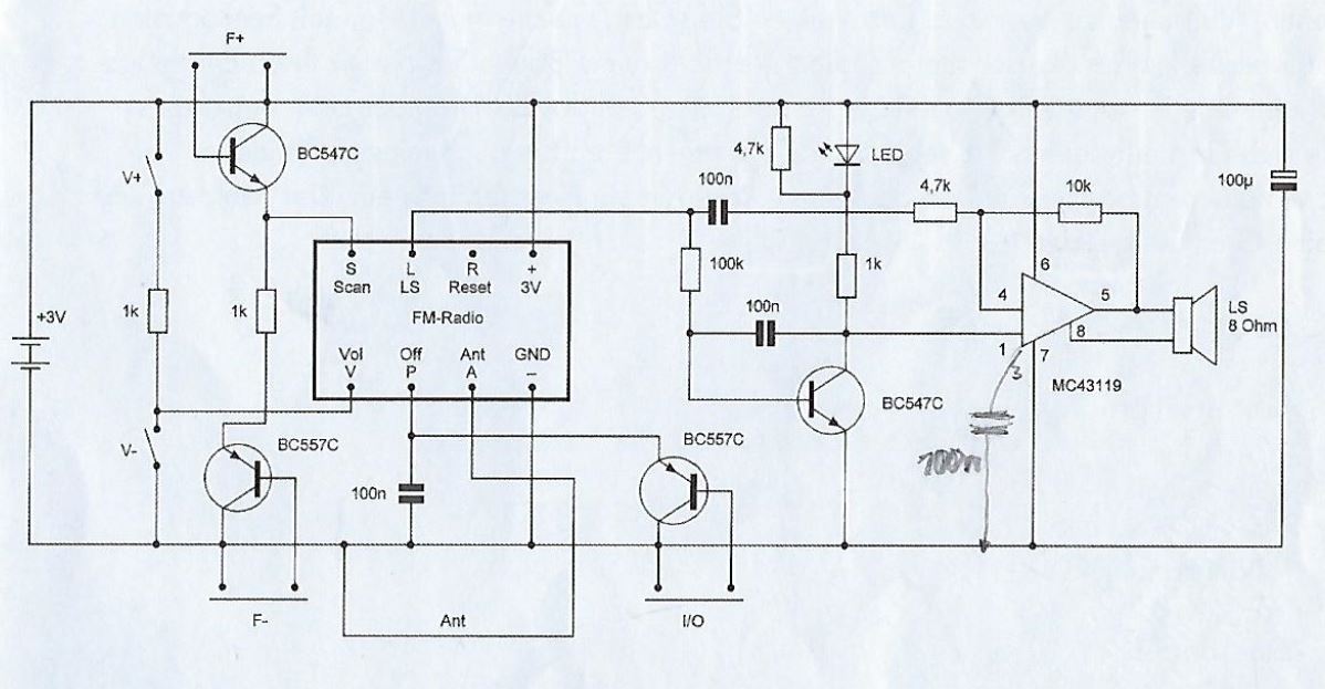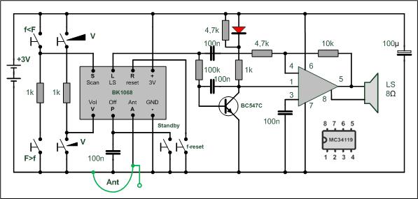 der aufgebauten Variante (rechts) werden nur Schalter benutzt. Damit auch brauchbar ein Lautsprecher betrieben werden kann, wird ein weiterer Verstärker-IC MC34119 verbaut. Der Schaltkreis kann ebenfalls mit dem Ausschalten des DSP in einen Sparbetrieb versetzt werden, das spart Energie. |