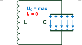 Nun noch einmal der elektrische Schwingkreis. Ist der Strom am größten ist der Kondensator leer, eigentlich kann kein Strom mehr fließen, die Quelle hat die Spannung 0! Man muss eben beachten, dass mit der Spule ein magnetisches Feld erzeugt wird. Und bricht dieses zusammen, wird ein Strom erzeugt, der dann wieder für das Aufladen des Kondensators sorgt. |