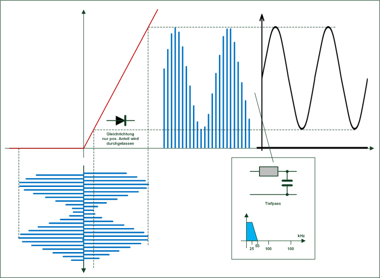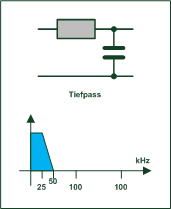 Das ist der Vorgang zur "Hörbarmachung" des Schallsignals, man nennt es Demodulation. Die rote Linie ist ganz stilisiert die Kennlinie einer Diode. Das modulierte Signal, über dem Kondensator vom Schwingkreis abgenommen, wird der Diode zugeführt (Signal kommt in der Zeichnung (links) von unten). Rein grafisch kann man das Signal an der roten Linie nach rechts projizieren - elektronisch, der negative Anteil des Signals wird abgeschnitten. Theoretisch kann man noch nichts hören, die hohe Frequenz muss entfernt werden. Das gelingt durch einen Tiefpass: ![]() Schließ man einen hochohmigen Kopfhörer an die Anordnung, wie oben gezeigt, geht es Widererwarten nun aber doch schon, denn der Kopfhörer kann die hohen Frequenzen nicht umsetzen, er wirk quasi wie ein mechanischer Tiefpass. |