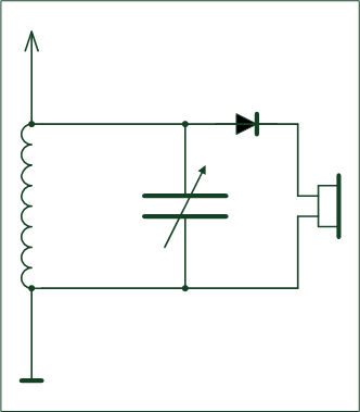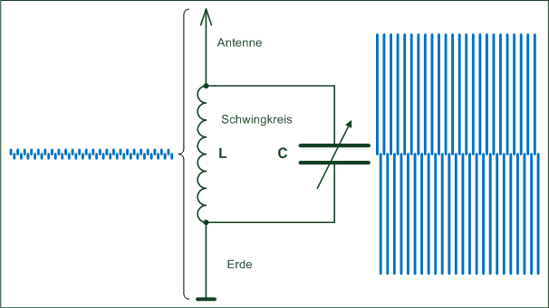 Der Schwingkreis wird etwas verändert! Als Kapazität wird der oben beschriebene Drehko, eine variable Kapazität, eingesetzt. Am Schwingkreis wird oben ein langer Draht (etwa 10m) und unten wird er mit der Erde, z.B. die Heizung, verbunden. Ziel ist, Rundfunkwellen im Raum zu finden. Das ist nicht schwer, denn der Raum ist voll von elektro-magnetischen Wellen. Das sind nicht nur die Rundfunkwellen, sonder auch die Wärme, das Licht, Röntgen- und Gammawellen.