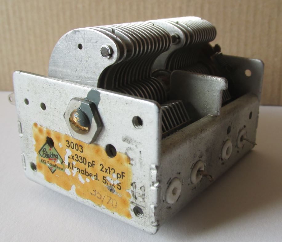 Das alte Teil habe ich nicht mehr, dies ist schon ein etwas neuerer - es ist ein Dreh-Kondensator oder kurz Drehko. Es ist ein Kondensator mit variabler Kapazität, für die Kapazität gilt:
